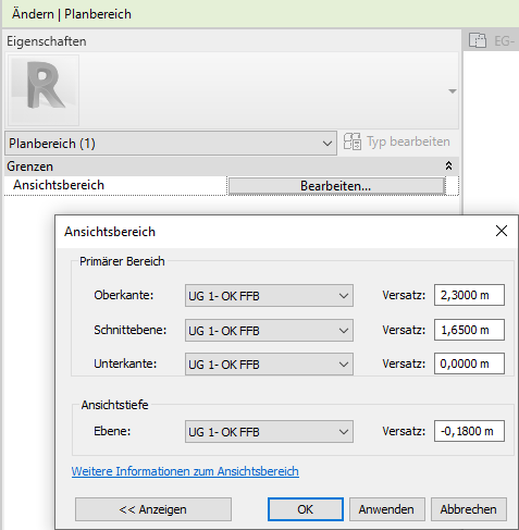 Ist der Planbereich aktiviert kann im Eigenschaftendialog die Schnittebenenlage konfiguriert werden