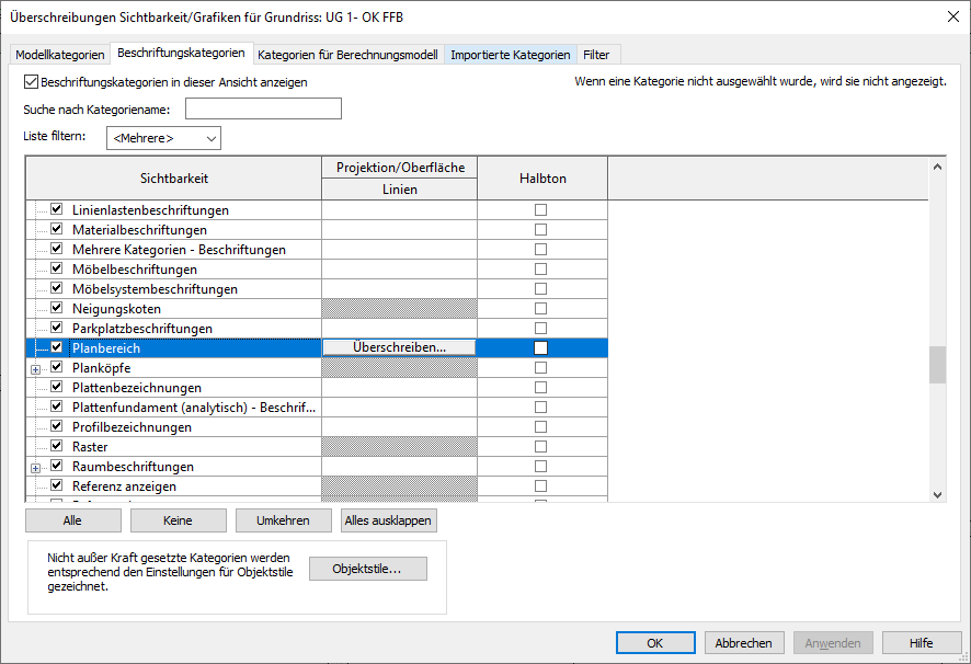 Über Sichbarkeitseinstellungen können die Planbereiche unsichtbar gemacht werden. Somit werden diese in den Ausgabeplänen nicht angezeigt.